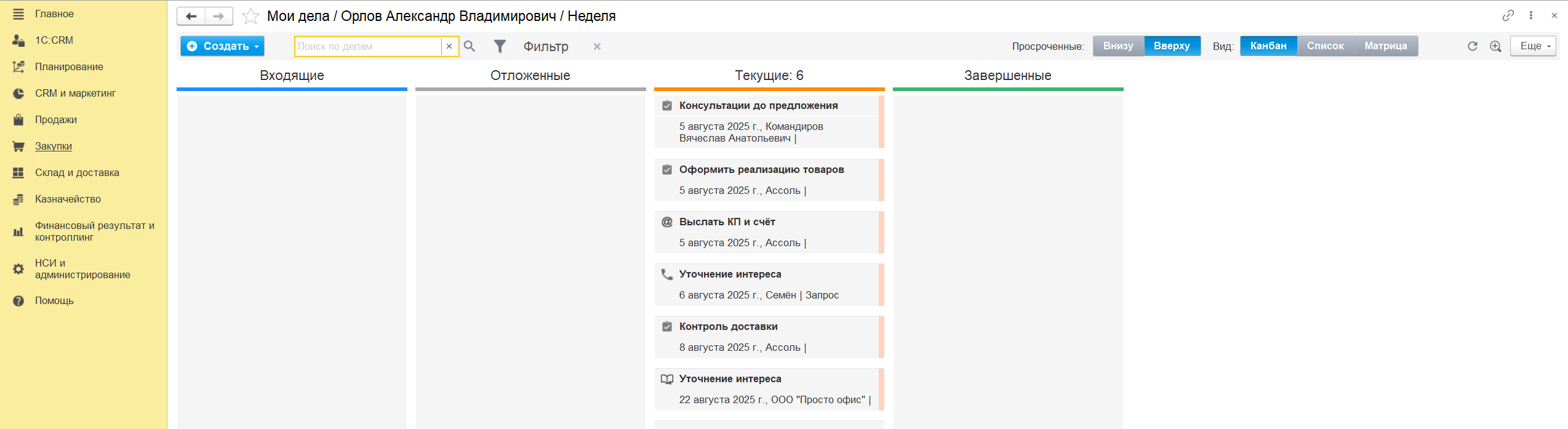 Вся информация по взаимодействиям отображается у менеджера в рабочем месте (АРМ) «Мои дела» в разделе «Главное».