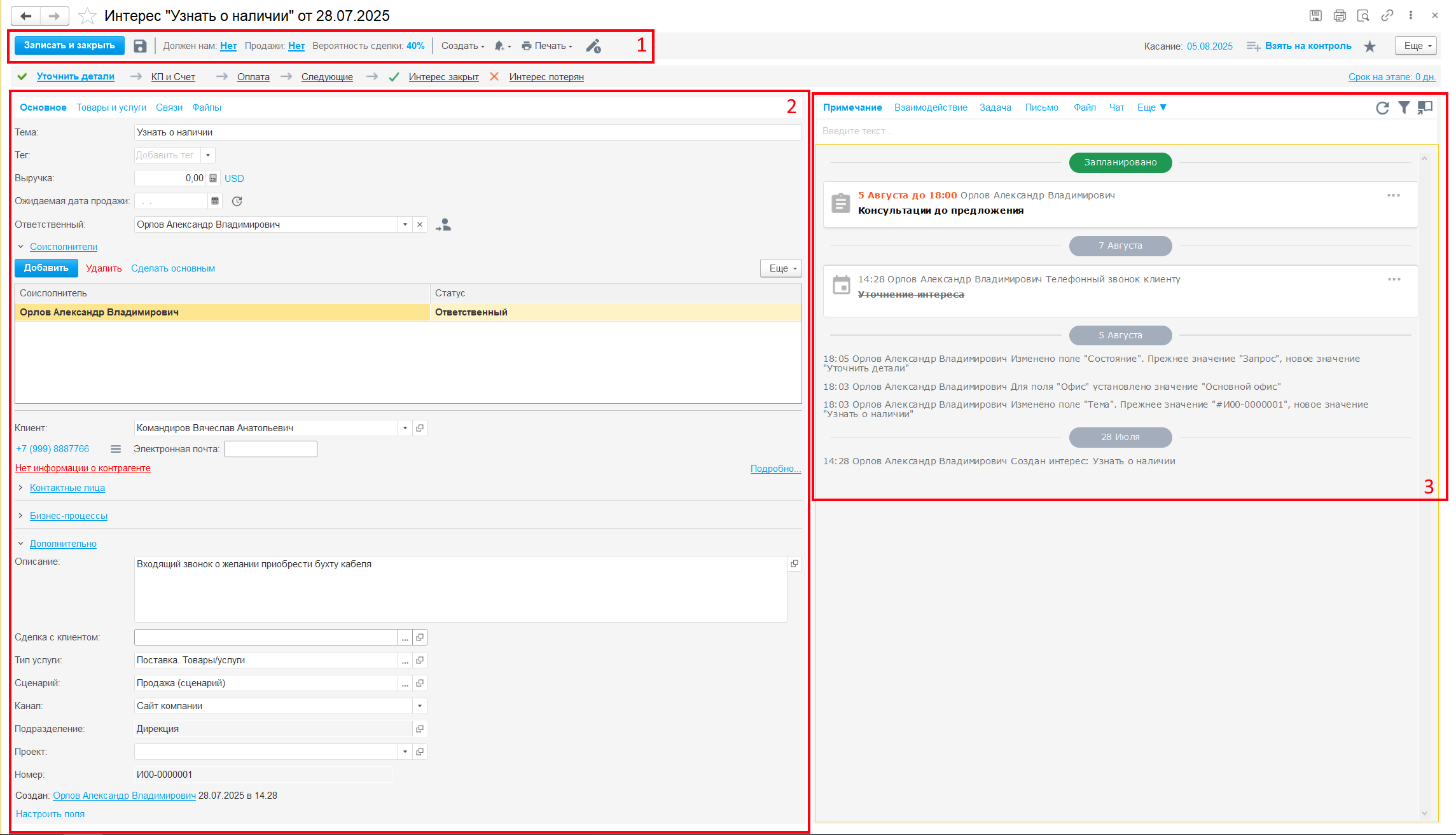 Напомним, что вся коммуникация с клиентами ведется через документ «Интерес клиента». В этом документе необходимо фиксировать полную историю всех входящих и исходящих контактов.