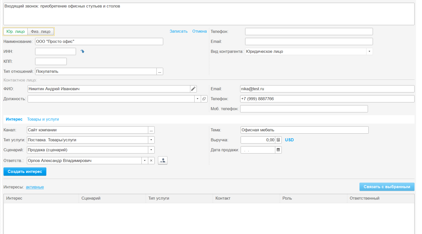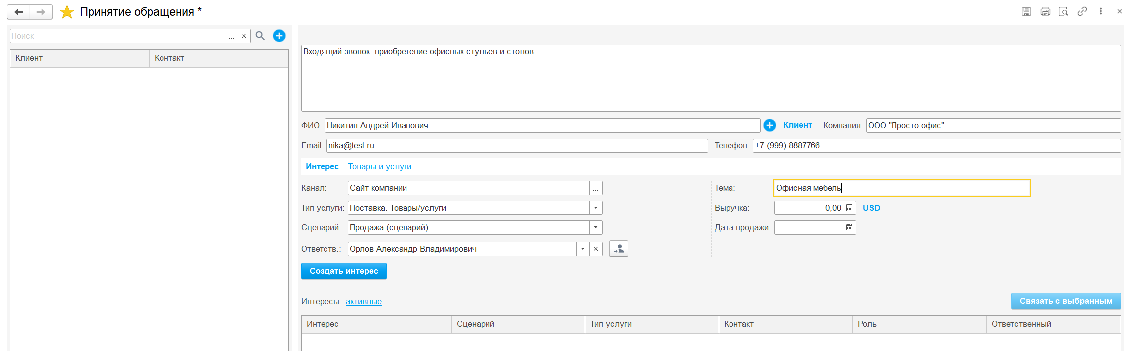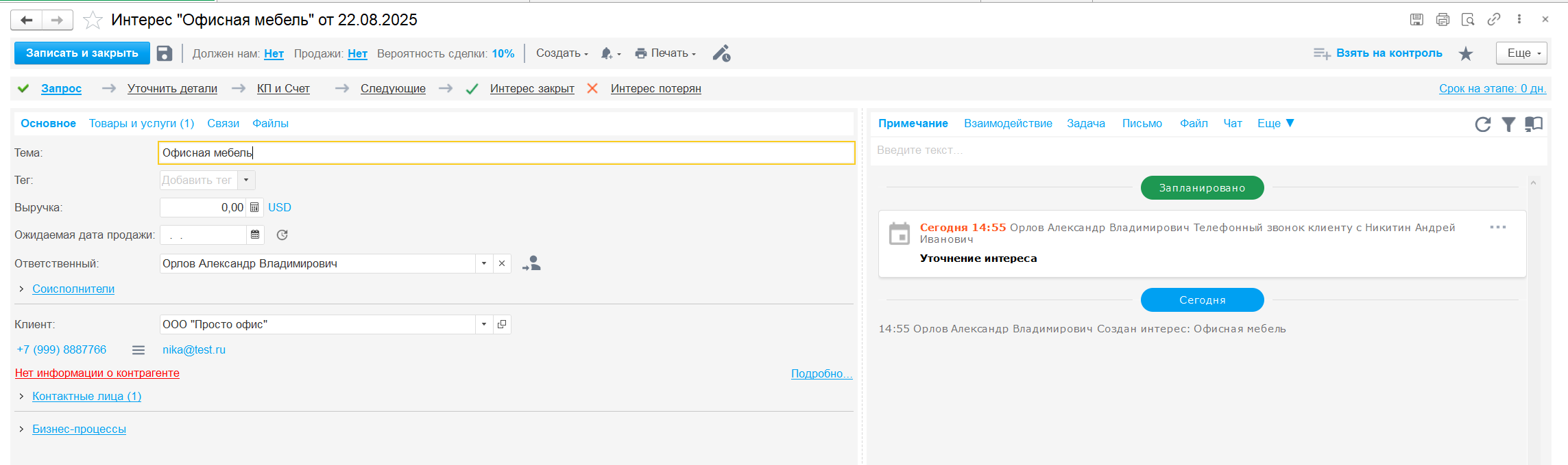6. После завершения разговора, заполнения всех полей, остаётся лишь нажать “Создать интерес”, чтобы работать с карточкой Интереса.