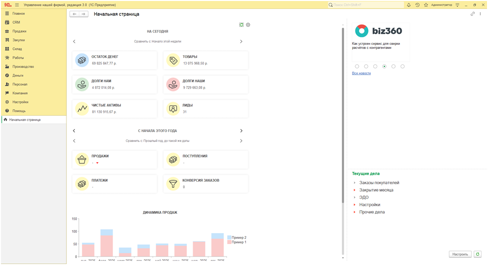 1С:Управление нашей фирмой — современное универсальное решение на платформе «1С:Предприятие 8», предназначенное для автоматизации управленческого учёта и бизнес-процессов малого и среднего бизнеса. В одной системе программный продукт объединяет учёт торговли, складов, производства, услуг, кадров, финансов и CRM-функционал, выступая как ERP для малого бизнеса