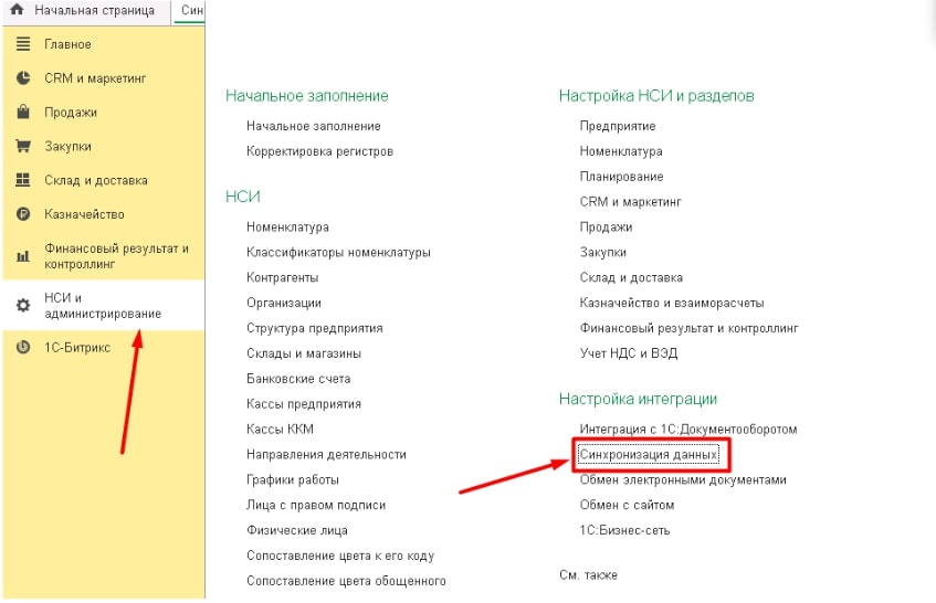 Первым шагом необходимо перейти в раздел администрирования системы. Для этого откройте интерфейс «НСИ и администрирование» и выберите пункт «Синхронизация данных» (рис. 1).