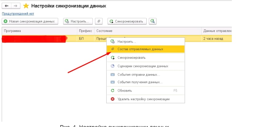 Перед вами откроется список всех настроенных обменов. Выберите из списка нужный узел синхронизации, кликните по нему правой кнопкой мыши и в контекстном меню выберите опцию «Состав отправляемых данных» (рис. 2, рис. 3).