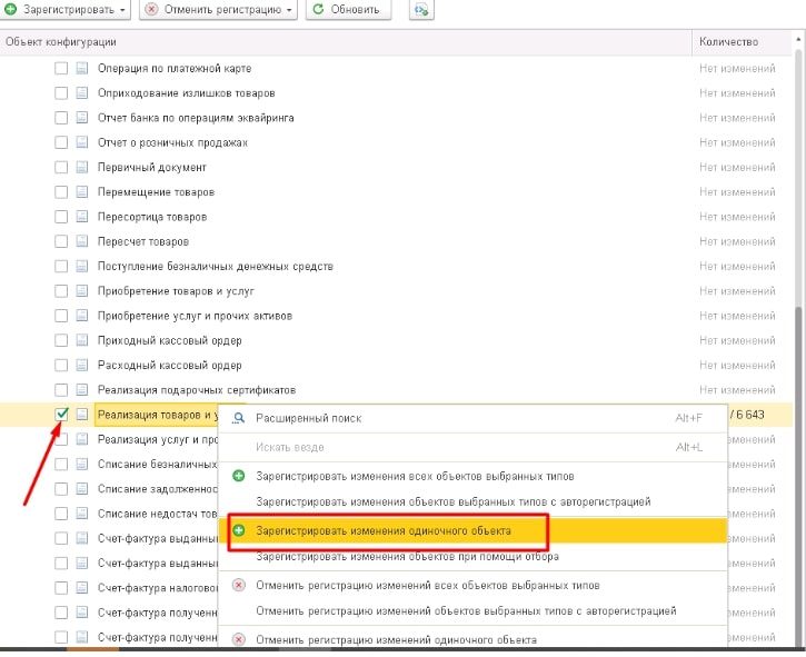 Для точечного добавления конкретных документов необходимо кликнуть правой кнопкой мыши на нужном виде документа (например, «Реализация товаров и услуг») и выбрать пункт «Регистрация изменений одиночного объекта».