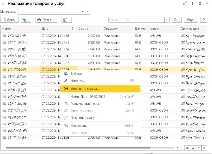 Выбор документов за период: Кликните правой кнопкой мыши по любому документу в списке и выберите пункт «Выделить период». В появившемся диалоговом окне укажите начальную и конечную даты. Система автоматически выделит все документы, попавшие в этот интервал (рис. 5).